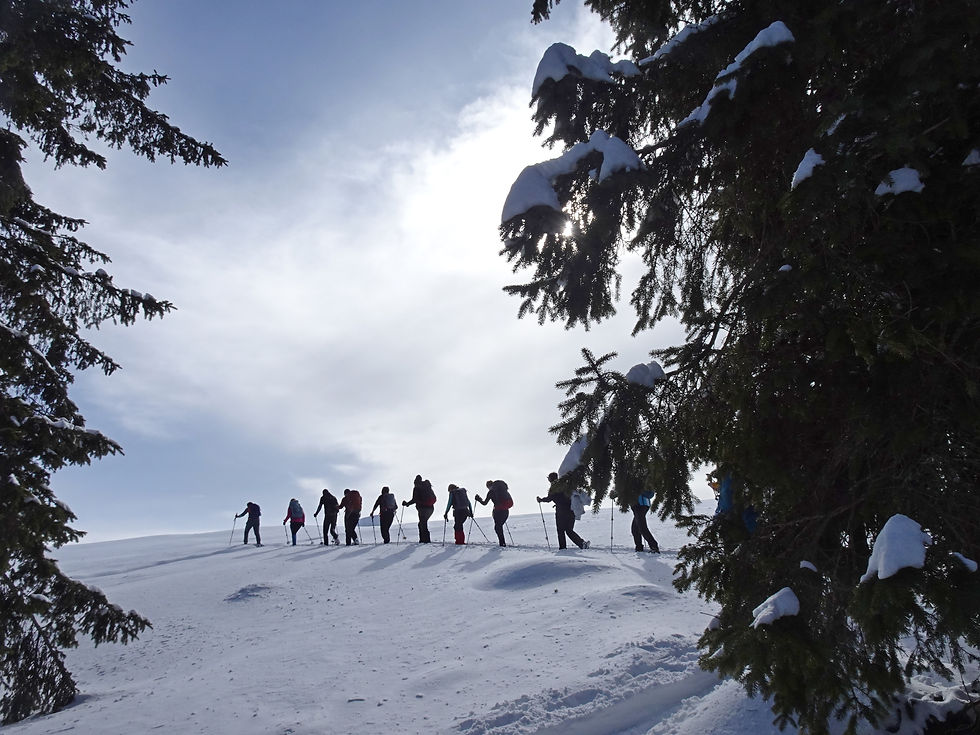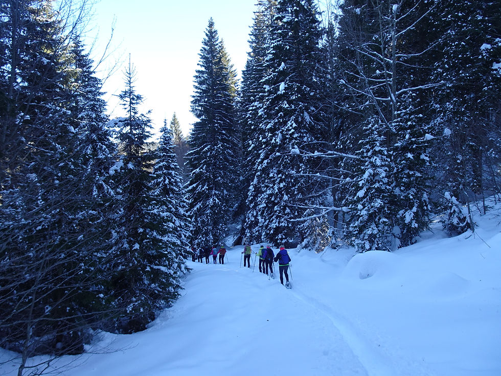 Sonce in belina slepita, smeh se pripelje na obraze, dobra volja skoraj kriči. Okrepčamo se z nekaj dobrotami iz nahrbtnika, dogovorimo o načinu funkcioniranja, namestimo krplje na tačke in se podamo v doživetje. Koliko snega! KOLIKO SNEGA!